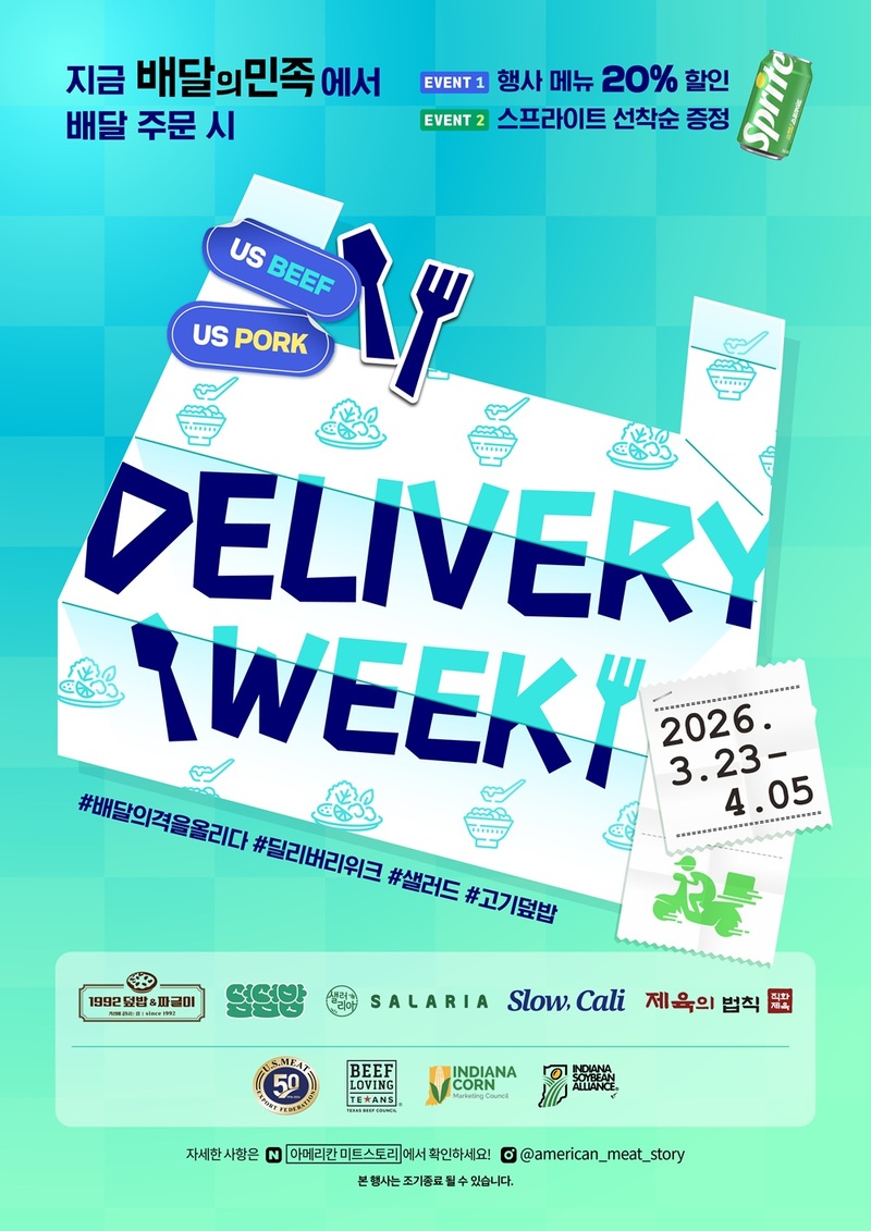 ‘2026 딜리버리위크 시즌1’은 ▲1992덮밥&짜글이 ▲덮덮밥 ▲샐러리아 ▲슬로우캘리 ▲제육의법칙 등 5개 브랜드, 총 526개 매장이 참여해 역대 최대 규모로 진행된다(일부 매장 제외). 행사 기간 동안 소비자들은 짜글이·덮밥·제육볶음 등 푸짐한 한식부터 샐러드·포케·샌드위치 같은 가벼운 일상식 및 건강식까지, 미국산 소고기와 돼지고기를 활용해 고품질 단백질과 깊은 풍미를 선사하는 메뉴들을 다채롭게 만나볼 수 있다. 배달의민족 앱을 통해 참여 브랜드의 행사 메뉴를 주문하면 20% 할인 혜택이 제공되며, 스프라이트 350ml도 선착순으로 증정된다.